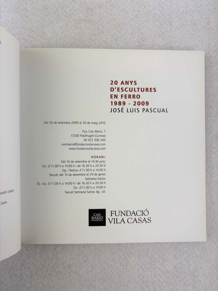 Catálogo de la exposición «20 anys d’escultures en ferro 1989–2009» dedicada a la obra de José Luis Pascual, celebrada en Can Mario (Fundació Vila Casas).