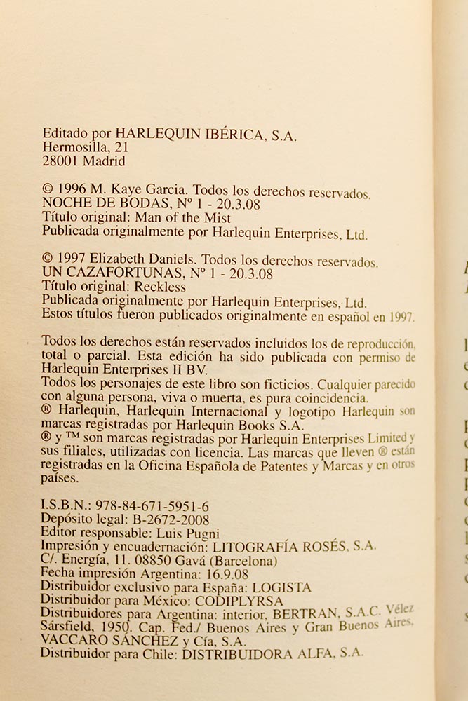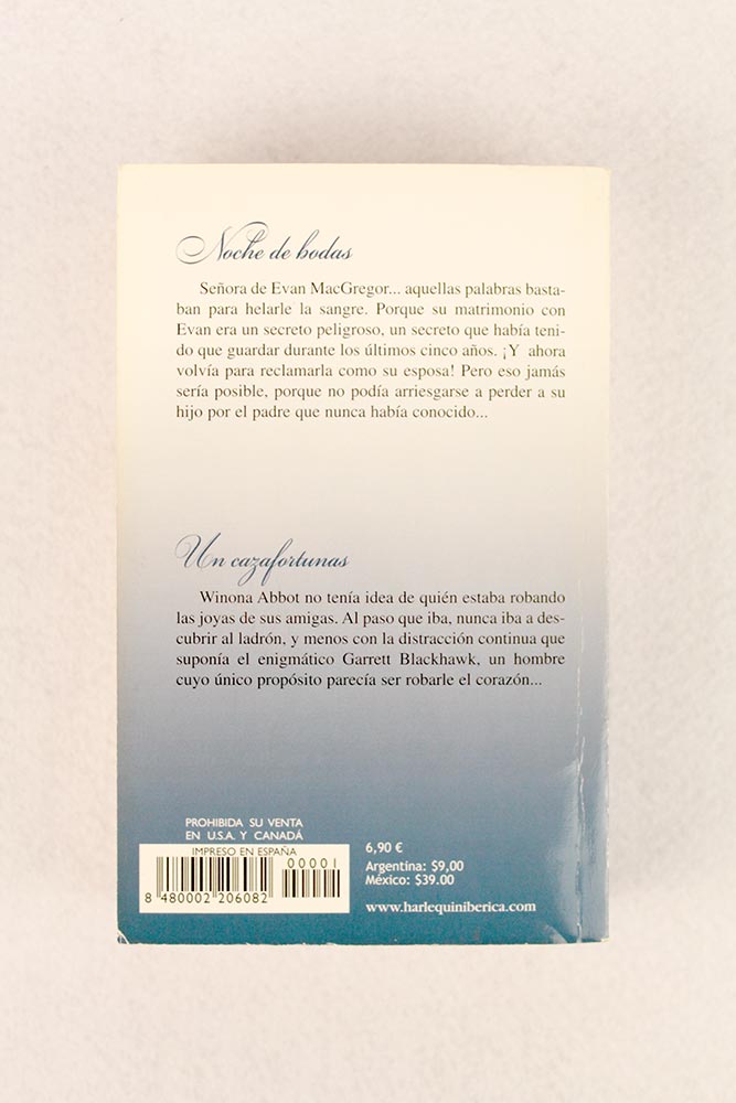 Noche de bodasElizabeth MayneSeñora de Evan MacGregor… aquellas palabras bastaban para helarle la sangre. Porque su matrimonio con Evan era un secreto peligroso, un secreto que había tenido que guardar durante los últimos cinco años. ¡Y ahora volvía para reclamarla como su esposa! Pero eso jamás sería posible, porque no podía arriesgarse a perder a su hijo por el padre que nunca había conocido… Un cazafortunasBeth HendersonWinona Abbot no tenía idea de quién estaba robando las joyas de sus amigas. Al paso que iba, nunca iba a descubrir al ladrón, y menos con la distracción continua que suponía el enigmático Garrett Blackhawk, un hombre cuyo único propósito parecía ser robarle el corazón…