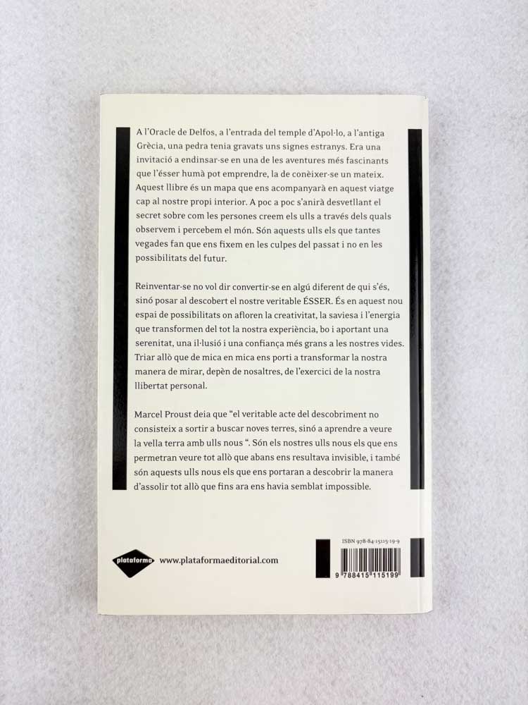 Reinventar-se no vol dir convertir-se en algú diferent de qui s’és, sinó posar al descobert el nostre veritable ÉSSER. És en aquest nou espai de possibilitats on afloren la creativitat, la saviesa i l’energia que transformen del tot la nostra experiència, bo i aportant una serenitat, una il·lusió i una confiança més grans a les nostres vides. Triar allò que de mica en mica ens porti a transformar la nostra manera de mirar, depèn de nosaltres, de l’exercici de la nostra llibertat personal.